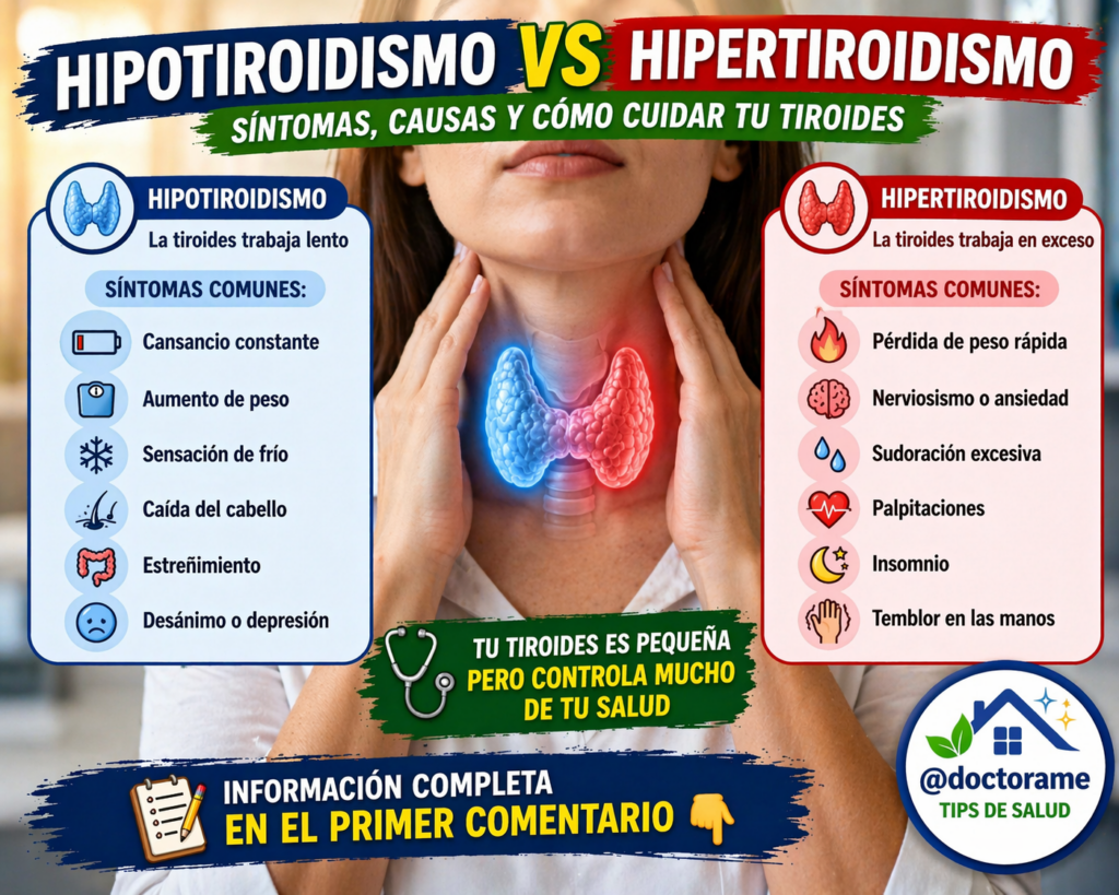 La tiroides es una pequeña glándula ubicada en el cuello, pero cumple una función enorme en tu cuerpo: regula el metabolismo, la energía, la temperatura y hasta el estado de ánimo. Cuando esta glándula no funciona correctamente, pueden aparecer dos trastornos principales: hipotiroidismo (cuando produce pocas hormonas) e hipertiroidismo (cuando produce demasiadas).